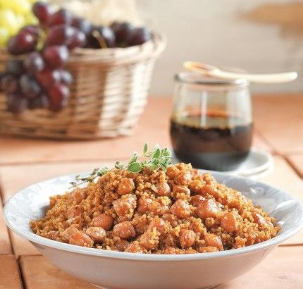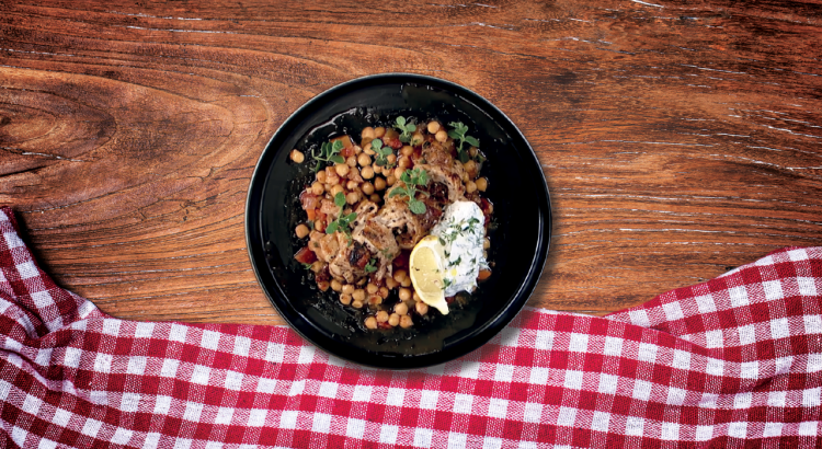 Στη συνέχεια, βάζουμε τον κύβο, σβήνουμε με το κρασί και αφήνουμε να εξατμιστεί. Ρίχνουμε την ντομάτα, το μέλι, το νερο, τα ρεβίθια και ανακατεύουμε.